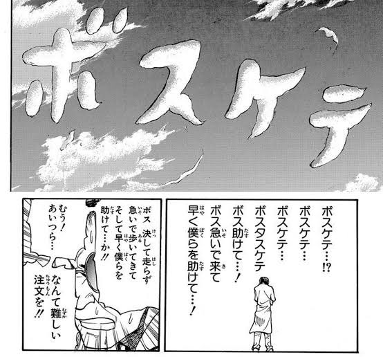 しかしキースは「ボスたすけて」と伝えるつもりで「ボスケテ」と送ったが、メッセージを受け取ったボスは「ボス 決して走らず 急いで歩いてきて そして早く僕らを 助けて…」という意味だと勘違いするというシーンである。