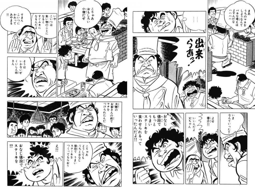この台詞が有名になったのは、漫画内でこの台詞を放った主人公がその直前のページで「おなじ値段でもっとうまいステーキを食わせられるっていったんだよ!!」と自分で啖呵を切ったのにもかかわらず、次のページで「え!! おなじ値段でステーキを!?」ことだ。このトンチンカンな台詞回しがネットユーザーの間で大いにウケ、広く知られることとなった。